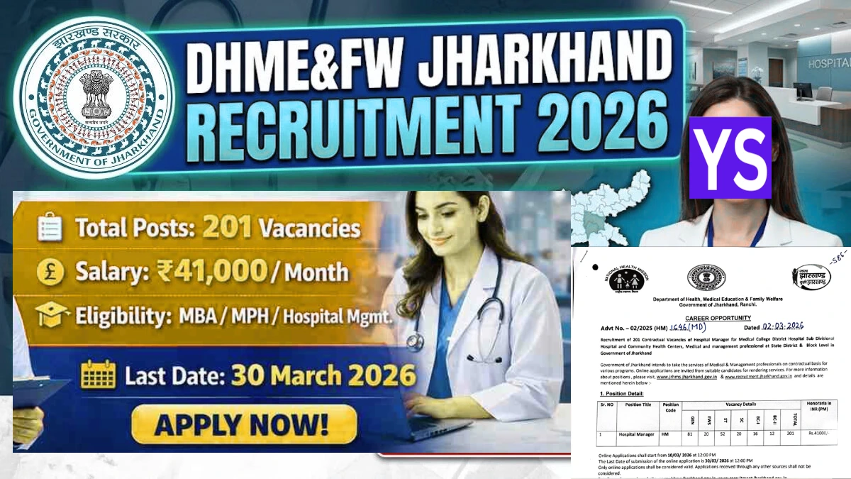 झारखंड सरकार के स्वास्थ्य, चिकित्सा शिक्षा एवं परिवार कल्याण विभाग (DHME&FW) ने राज्य के सरकारी अस्पतालों के प्रबंधन को और अधिक प्रभावी एवं पेशेवर बनाने की दिशा में एक बड़ी पहल की है। विभाग ने हॉस्पिटल मैनेजर (अस्पताल प्रबंधक) के 201 रिक्त पदों पर भर्ती के लिए अधिसूचना जारी कर दी है। यह उन युवा पेशेवरों के लिए एक शानदार अवसर है, जिनके पास अस्पताल प्रबंधन या सार्वजनिक स्वास्थ्य में विशेषज्ञता है और वे स्वास्थ्य सेवा क्षेत्र में प्रशासनिक भूमिका निभाकर समाज की सेवा करना चाहते हैं।